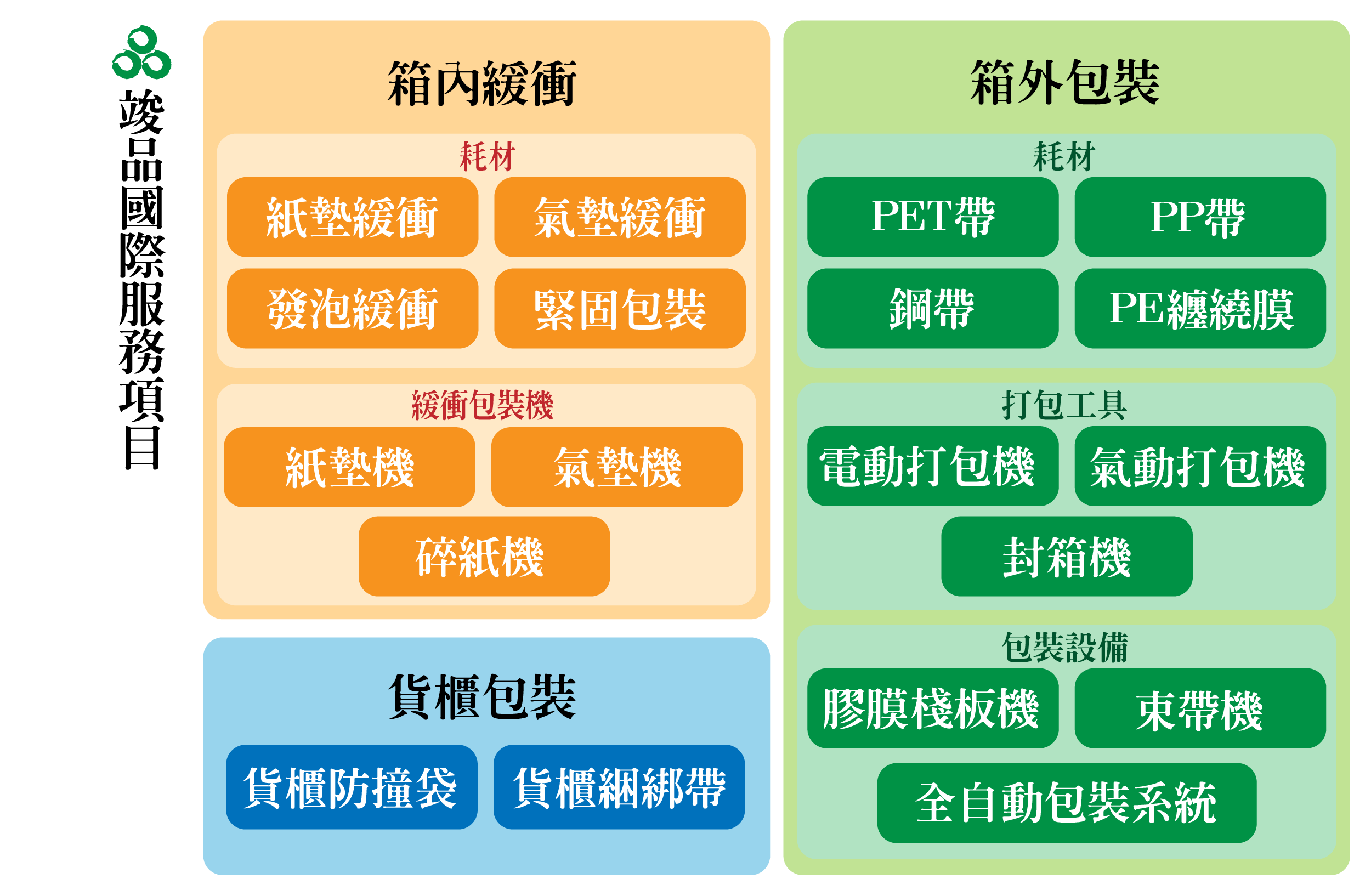多樣化耗材:貨櫃防撞袋、PP 打包帶、PE 伸縮膜、熱收縮膜、鐵扣、包裝膠帶。