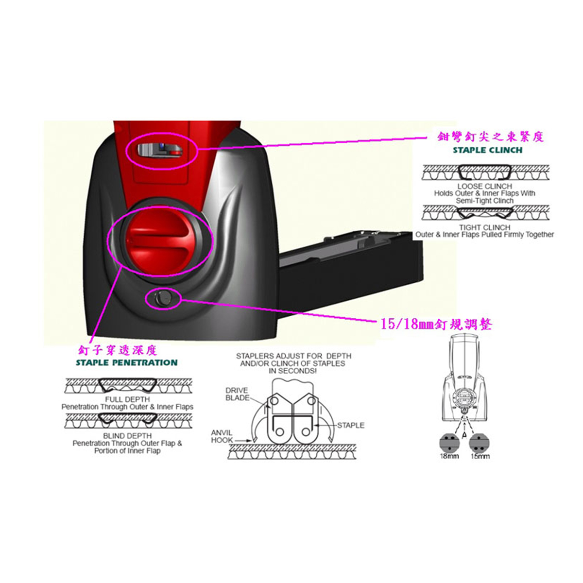 免工具深度調整: 配備專屬封箱釘穿透深度調整鈕,無需任何額外工具即可快速調整封箱針的深淺 。