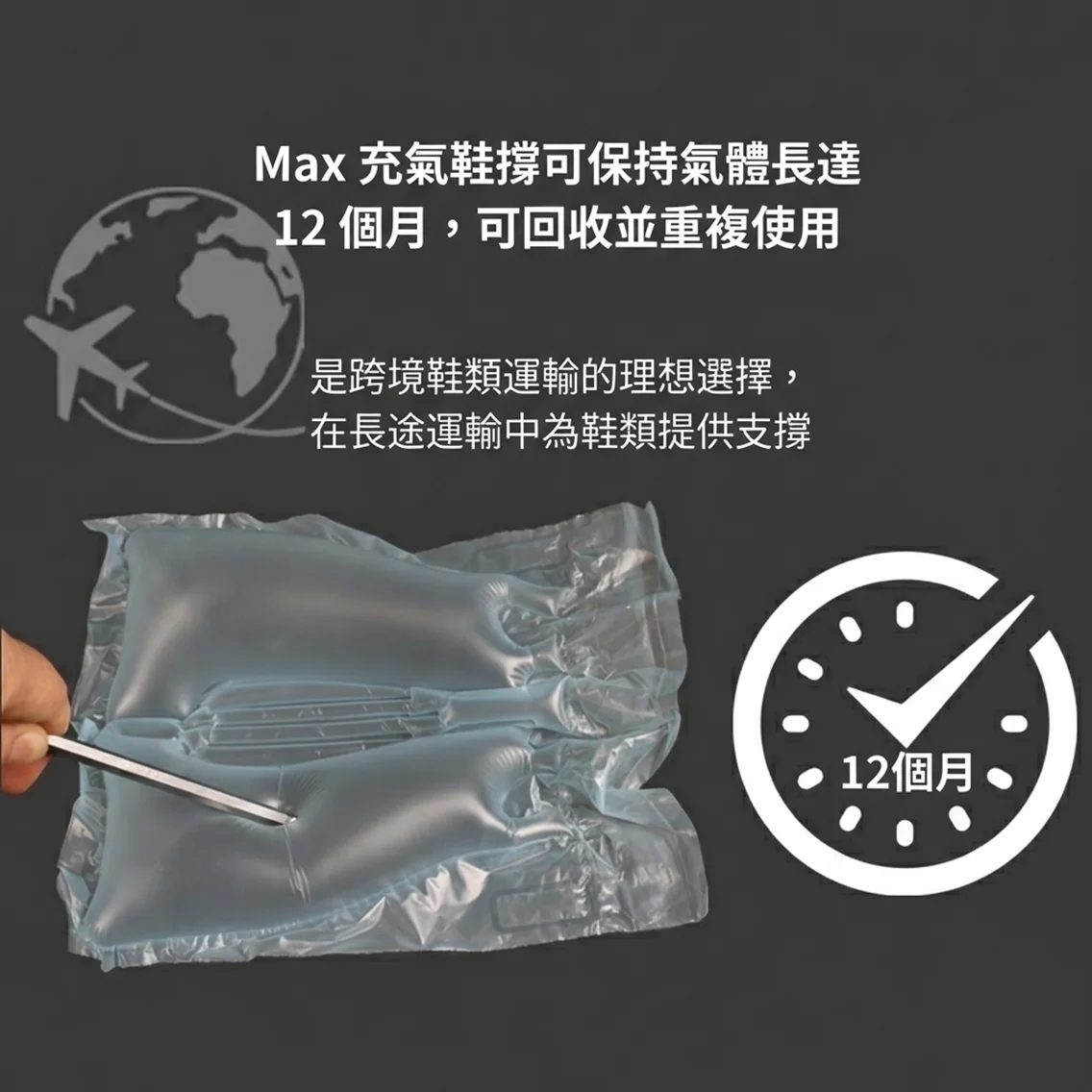 對於跨境電商而言,重量就是金錢。MAX 鞋撐的超薄設計顯著減輕了單個包裹的重量,相比傳統填充物,能大幅降低國際物流運費。同時,其「隨需充氣」特性意味著未充氣前幾乎不佔空間,為您釋放寶貴的倉儲面積。