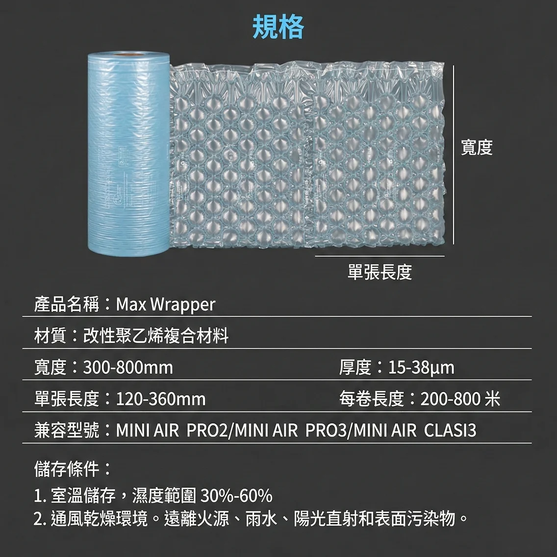 適用物流 (Logistics) | 國際小包、長途海運、跨境電商 | 專為長途、長時間運輸設計,確保到貨時氣泡依然飽滿。 |