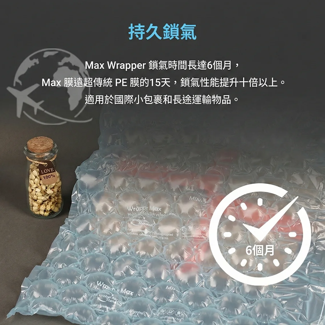 傳統 PE 氣泡膜往往在 15 天後便開始消氣,失去保護力。MAX Wrapper 採用特殊的鎖氣技術,將空氣保持時間延長至 6 個月以上,性能提升超過 10 倍。這使其成為國際跨境電商及長途海運的理想選擇,確保貨物抵達終點時,緩衝效果依然如初。