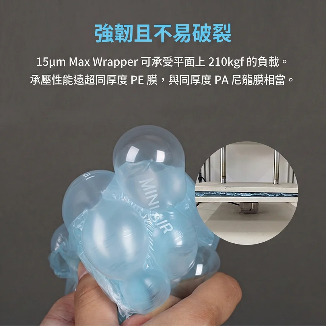 別被它的薄度騙了!MAX Wrapper 在平面上可承受高達 210kgf 的靜態壓力。其抗壓性能遠超同厚度的普通 PE 膜,甚至媲美高昂的 PA 尼龍膜。無論是重物堆疊還是運送過程中的擠壓,它都能提供堅若磐石的緩衝保護。