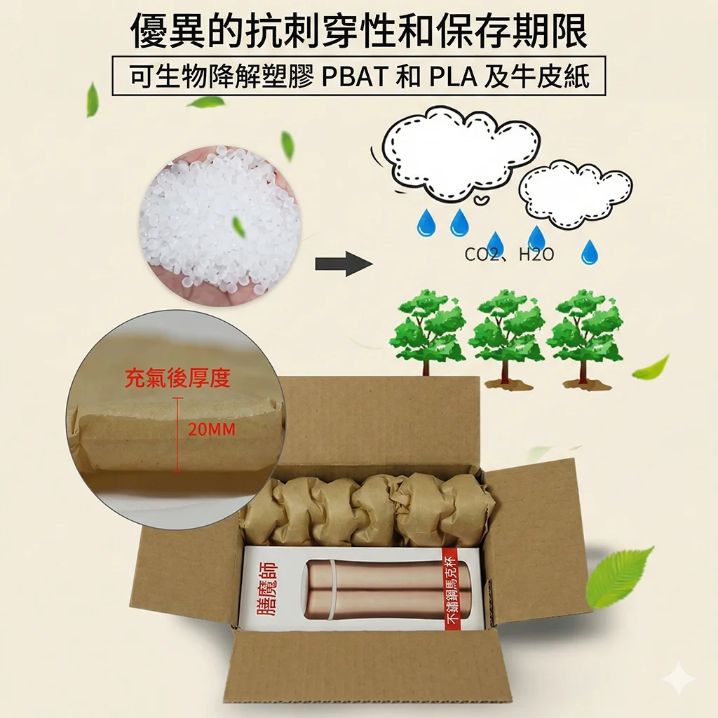 最關鍵的創新在於其澱粉基材密封技術,取代了傳統的塑膠封條,確保整個氣墊在自然環境中能完全分解,不留微塑料汙染。這不僅是塑膠充氣袋的理想替代品,更是企業實踐減塑政策、提升企業社會責任形象的最佳利器。