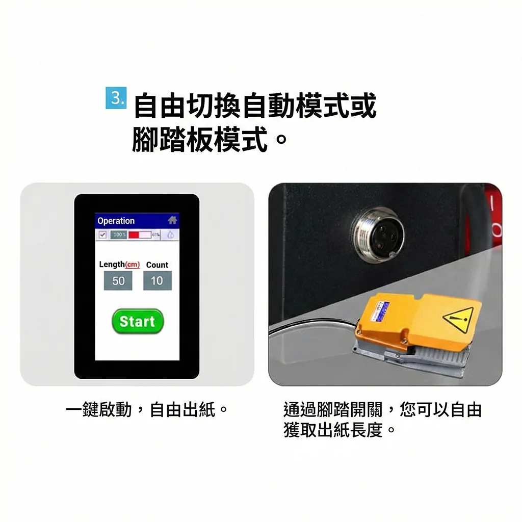 自動切刀與定長裁切 (Auto Cutter): 可精準預設所需長度,機器自動裁切,確保包裝標準化並減少耗材浪費。