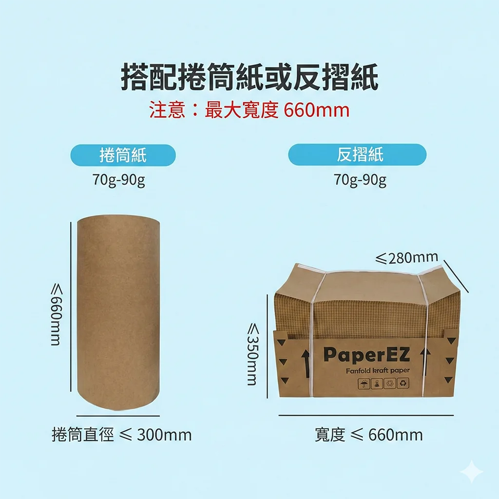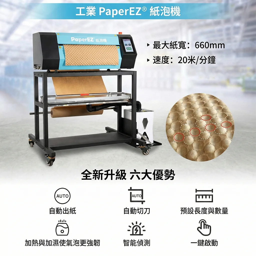 如果您正在尋找一台能應對高流量、大型物件且要求極高防護力的包裝設備,PaperEZ® 660 憑藉其獨有的加熱加濕增強技術與工業級產能,將是您倉儲升級的終極選擇。