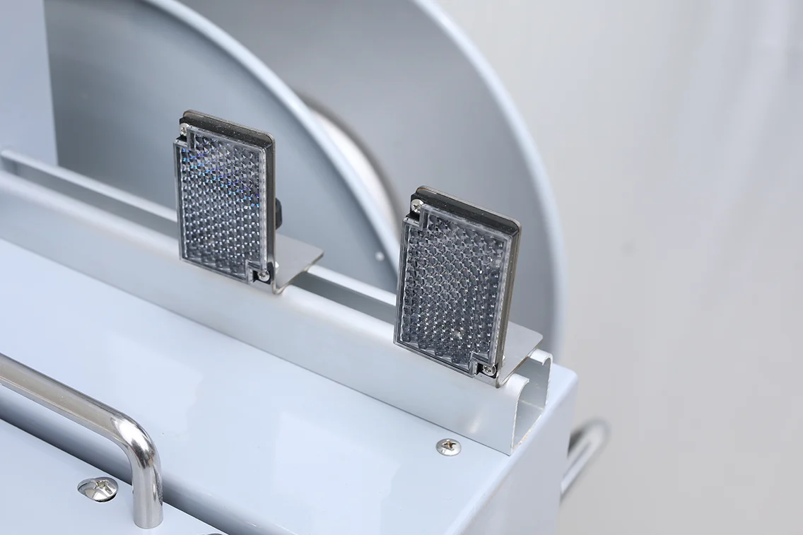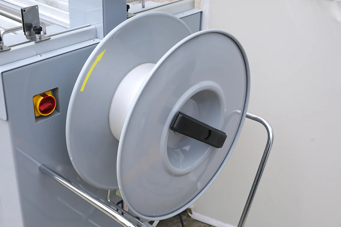 機器內建光電感應器,當大型貨物輸送至打包區時,機器會自動定位、捆紮(可預設打 1~3 條帶子)並送出,完全無需人工介入,大幅節省人力成本。
