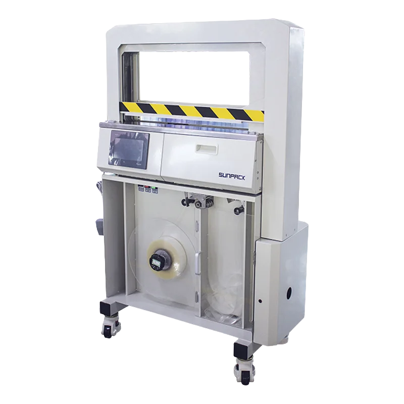 這款專業機型專為需要「先壓縮、後綑紮」的產品量身打造。無論是成疊的信封、空紙盒、毛巾或是各類不規則的軟性包裝,內建的氣動頂壓機構能預先將產品壓實固定後再進行束帶封口,徹底解決包裝後內部滑動或鬆脫的痛點 。