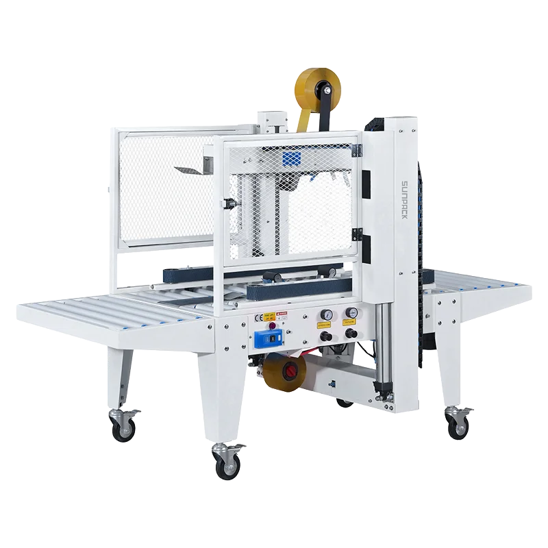 TPK-553ARL 全自動隨機規格封箱機是邁向無人化包裝線的理想選擇。不同於一般半自動機型需要人工手動搖柄調整尺寸,本機型具備智慧感應系統,能針對進入產線的每一箱不同高度、寬度的紙箱,透過氣動機構即時自動定位。